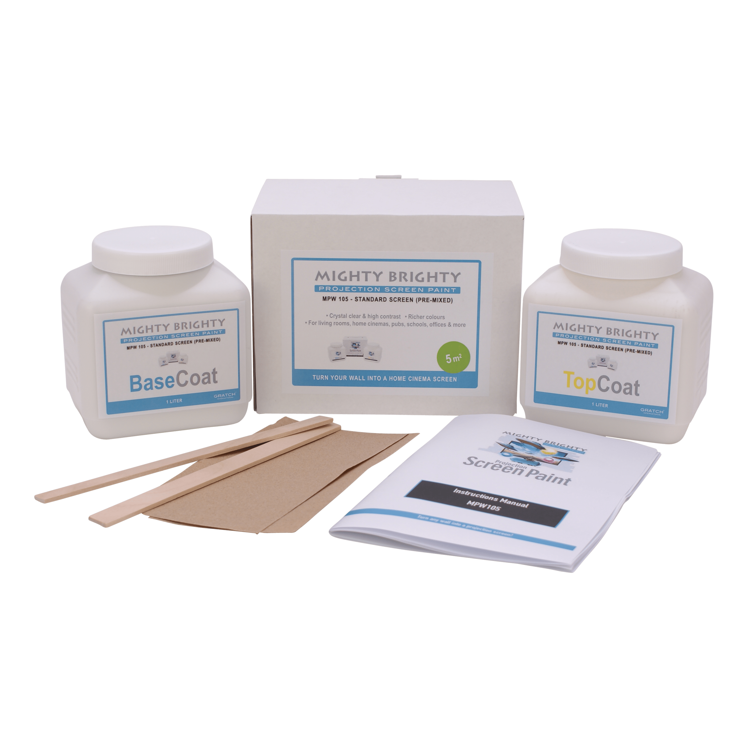 Pre-mixed, highly reflective paint, to apply a standard projection screen of up to 5 m² (54 sq.ft.) on your wall or board. The color of this screen is fixed and is very light gray approximately RAL 7047 (actually slightly lighter). The MPW 105 package has a contrast value of 2.5 and a gain value of approximately 1.1.